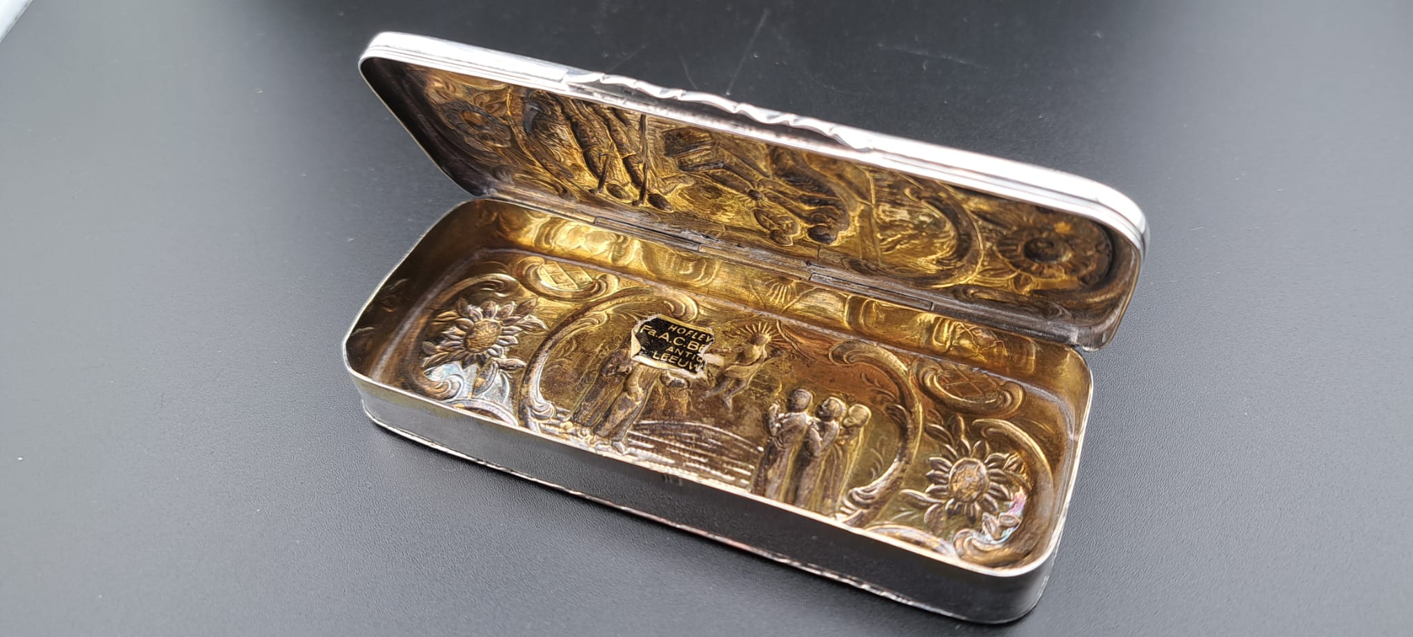 Zo af en toe lukt het De Groninger Zilverkamer om weer een interessant zilveren object te bemachtigen. Begin december was het raak. Er werd een zilveren tabaksdoosje aangeboden. Een doosje dat rond 1770 gemaakt is door de zilversmid Jacobus Reinder Frima in Appingedam. Het bescheiden doosje is in formaat en uitvoering typisch Gronings. Het meet 120 x 50 x 15 mm. De versieringen zijn Bijbelse taferelen, op de bovenzijde de geboorte van Jezus en op de onderzijde de Hemelvaart. De taferelen omgeven door C-voluten, zijn in gedreven techniek uitgevoerd met gegraveerde details. Het geheel is redelijk sober maar technisch goed uitgevoerd. Hier stonden de Groninger zilversmeden in de 18e eeuw om bekend. Zo’n tabaksdoosje geeft ook op andere vlakken informatie. Bijvoorbeeld over het tabaksgebruik. Vanaf ca. 1600 wordt er tabak geconsumeerd in Nederland. In het begin was het echt een luxe product waar zelfs geneeskrachtige werkingen aan toe werden geschreven. In de loop van de tijd werd het voor iedereen haalbaar en was het maatschappelijk normaal om tabak te roken. Sinds een aantal decennia is er, door voortschrijdend inzicht, een ontmoedigingsbeleid vanuit de overheid waardoor het tabaksgebruik afneemt. Dat tabak in de 17e en 18e eeuw een luxe product was zien we terug in het diverse aanbod zilveren tabaksverwante gebruiksartikelen, waaronder de diverse artikelen om tabak in de bewaren en mee te nemen. In de 17e eeuw werd tabak voornamelijk in pijpen gestopt, gesnoven en gepruimd. In deze tijd zien we tabakspotten. Toen er in de 18e eeuw zakken in kleding kwamen zag je meer en meer kleinere tabaksdozen om tabak mee te kunnen nemen onderweg. Vanaf 1850 wordt tabak steeds meer verwerkt in sigaren en later sigaretten en daarmee veranderden de dozen naar de afmeting van de sigaren en sigaretten. En nu weer terug naar het mooie zilveren tabaksdoosje van Frima. Dat past dus precies in de periode dat tabak meegenomen werd onderweg. Het was een gebruiksvoorwerp maar gaf indirect ook de status van de eigenaar aan. Hij kon zich tabak veroorloven, inclusief een zilveren doos! Zoveel informatie in zo’n kleinood! In De Groninger Zilverkamer zijn al een paar andere items van Jacobus Frima te bezichtigen, waaronder een zilveren brandewijnskom. Het moge duidelijk zijn dat het museum blij is met dit tabaksdoosje als aanvulling op de vaste collectie. Het doosje ooit gemaakt in Appingedam is terug in Appingedam