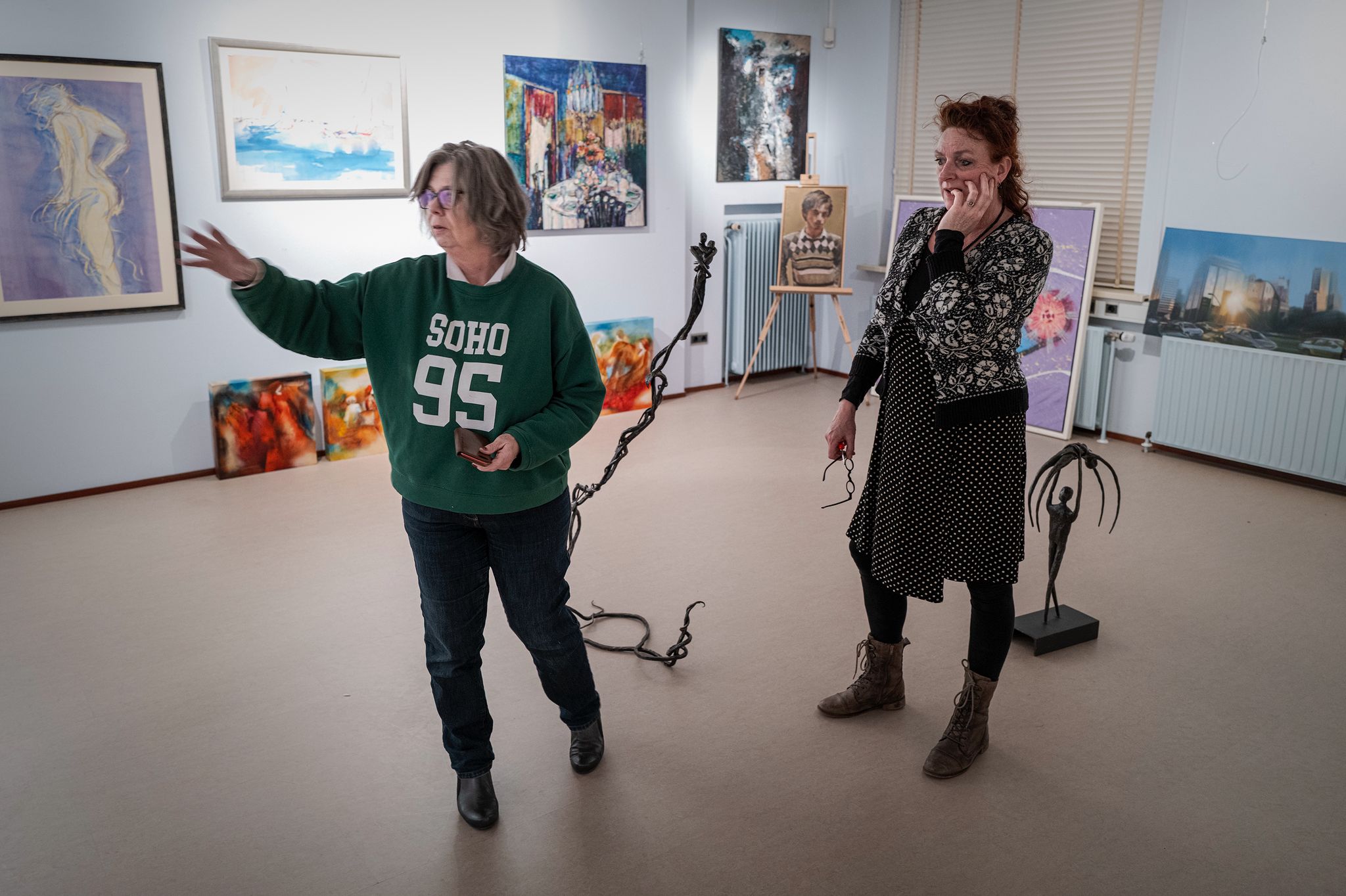 In de maand januari 2026 organiseert de Groninger Zilverkamer een pop-up verkoopexpositie. In de bovenzaal van de Zilverkamer is een gevarieerde collectie kunstwerken te zien en te koop, bestaande uit schilderijen, tekeningen, zeefdrukken en ander werk van uiteenlopende kunstenaars. Onder de deelnemende kunstenaars bevinden zich onder anderen Jan Altink, John Gardella, Jörg Döring, Maya Wildevuur, Gert Jan Scholte Albers, Jan te Wierik en Espen Greger Hagen. De expositie biedt een brede selectie stijlen en technieken, wat zorgt voor een kleurrijk en divers geheel. De Groninger Zilverkamer is tijdens de reguliere openingstijden toegankelijk voor bezoekers. Speciaal voor deze pop-up verkoopexpositie is het daarnaast mogelijk om de expositie op afspraak te bezoeken. Geïnteresseerden kunnen een kunstwerk na betaling direct meenemen. Op de foto zijn Herma Grimmius en Nynke Gardenier te zien, die druk bezig zijn met het sorteren en ophangen van de kunstwerken ter voorbereiding op de expositie. Meer informatie is te vinden via Facebook (Zilverkamer), de website degroningerzilverkamer.nl of telefonisch via 0626588992